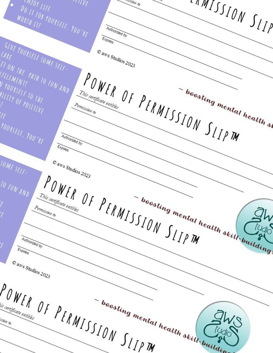 The Power of Permission slip gives you the opportunity to "gift" anyone - students, kids, relatives, friends, coworkers, etc. -"permission" to do things they want but often feel like they shouldn't or don't deserve to do. It's a gift of mental - social and emotional - health. What could be better than that?!
